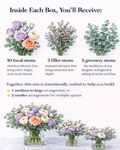 Our Classic Bloom Box is curated with 20+ premium stems designed to create multiple balanced, high-end arrangements without ever feeling skimpy.
